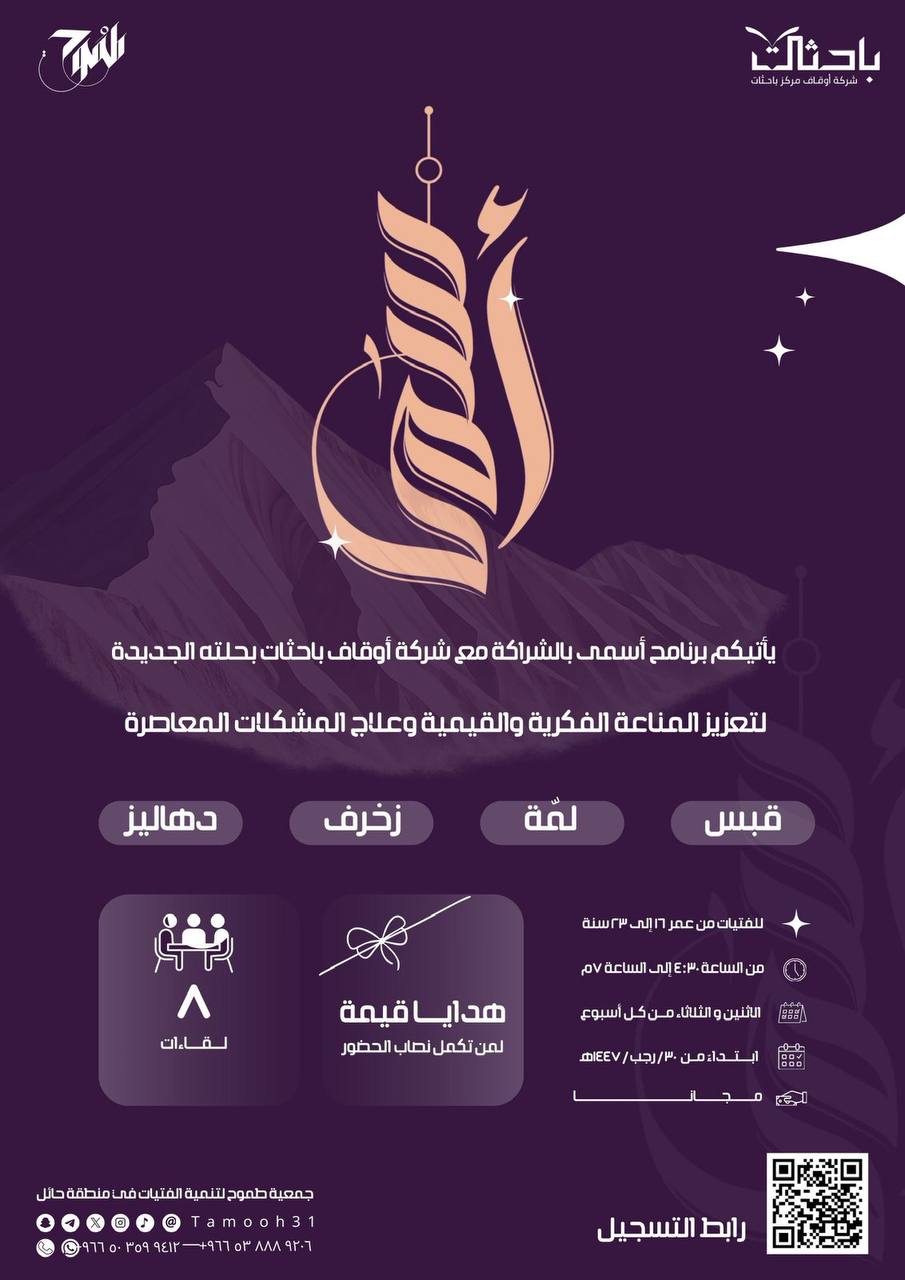 تُعلن جمعية طموح لتنمية الفتيات بحائل بالشراكة مع شركة أوقاف مركز باحثات عن بدء التسجيل في برنامج