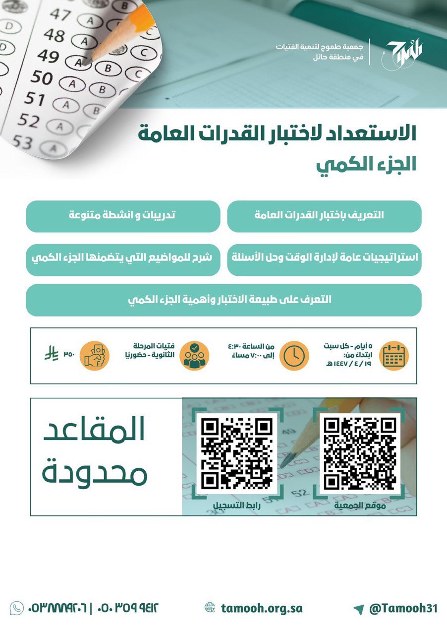 تعلن جمعية طموح لتنمية الفتيات عن إطلاق برنامج تدريبي يهيّئ الطالبات لاجتياز الجزء الكمي من اختبار القدرات العامة، من خلال: