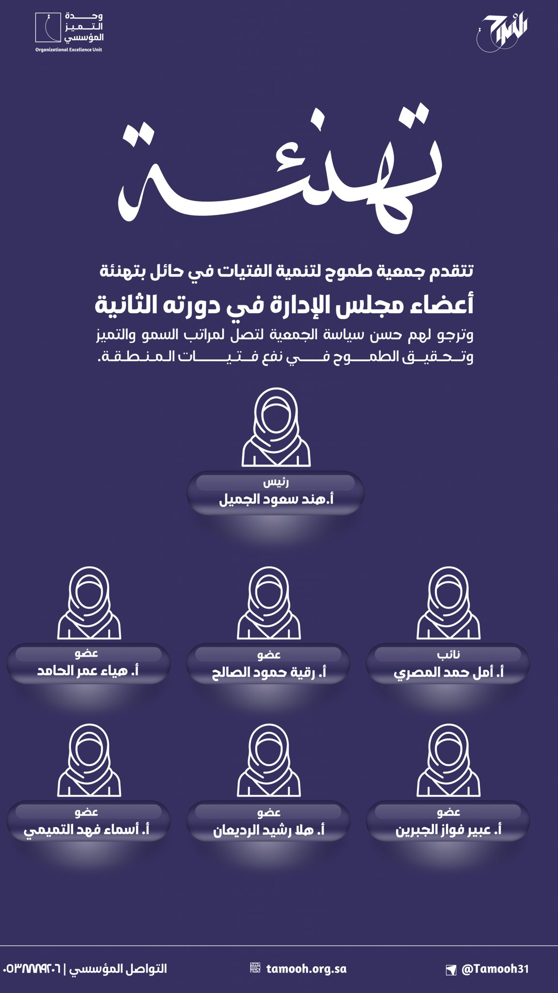 تتقدم جمعية طموح لتنمية الفتيات بحائل بتهنئة أعضاء مجلس الإدارة في دورته الثانية وترجو لهم حسن سياسة الجمعية لتصل لمراتب السمو والتميز وتحقيق الطموح في نفع فتيات المنطقة .